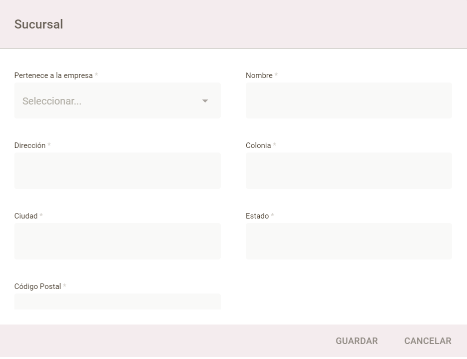 ¿Cómo agrego una sucursal? Para agregar una sucursal se tiene que dirigir al módulo de configuraciones y seleccionar el submódulo de sucursal.Véase en la ilustración: Una vez dentro tenemos que presionar en la opción de agregar (+) se desplegara una ventana con los siguientes campos a completar:Empresa *Nombre *Dirección *Colonia *Ciudad *Estado *Código Postal * Los campos que tienen un * al final son campos obligatorios por llenar sin ellos no se puede insertar el registro.Por último, tendremos que presionar el botón de GUARDAR y se estará insertando con éxito la sucursal nueva. Otras preguntas que te pueden ayudar: ¿Cómo elimino una sucursal? ¿Cómo agrego una nueva empresa? ¿Cómo elimino una empresa? ¿Cómo agrego un nuevo colaborador?